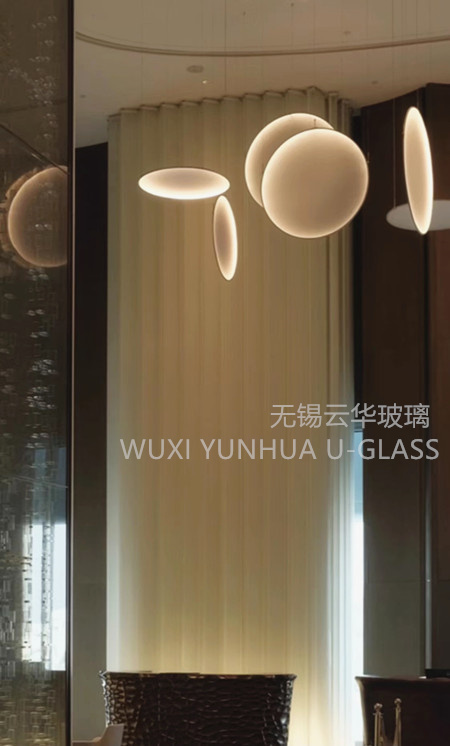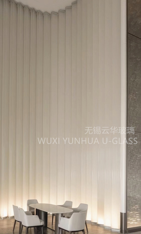 選用無錫云華K25*90*8超白波浪紋鋼化噴砂U型玻璃